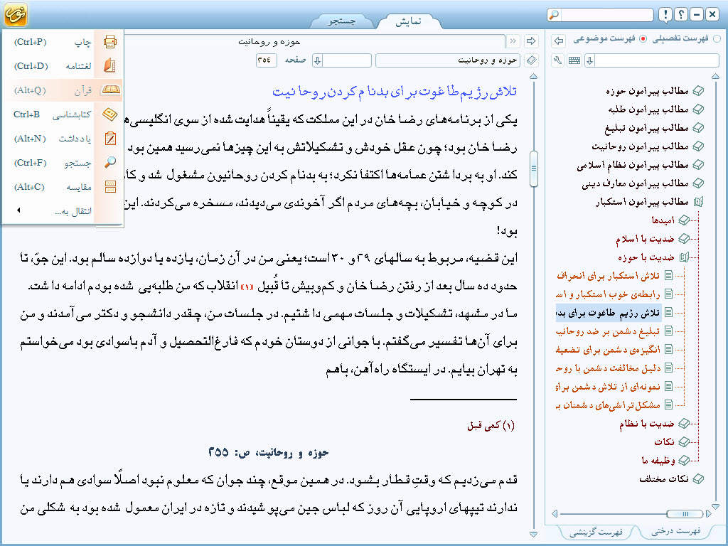 • امکانات پژوهشی به همراه قابلیت های: یادداشت‌‌ برداری، ذخیره سازی، ویرایش و چاپ متن